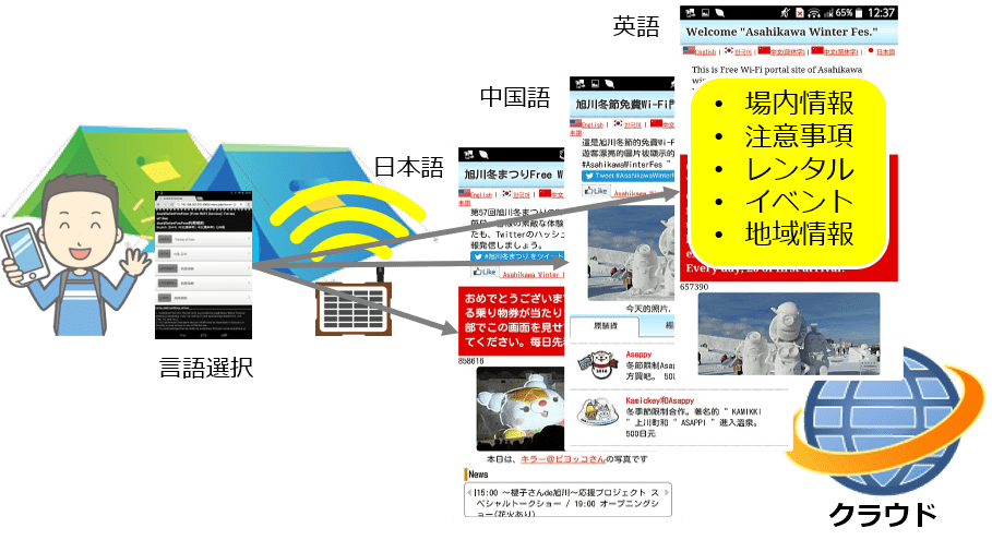 - 平前日に外国人観光客を取り込むため、Free Wi-Fiと連動する外国語の情報提供を自動的に行い稼働率増加を!